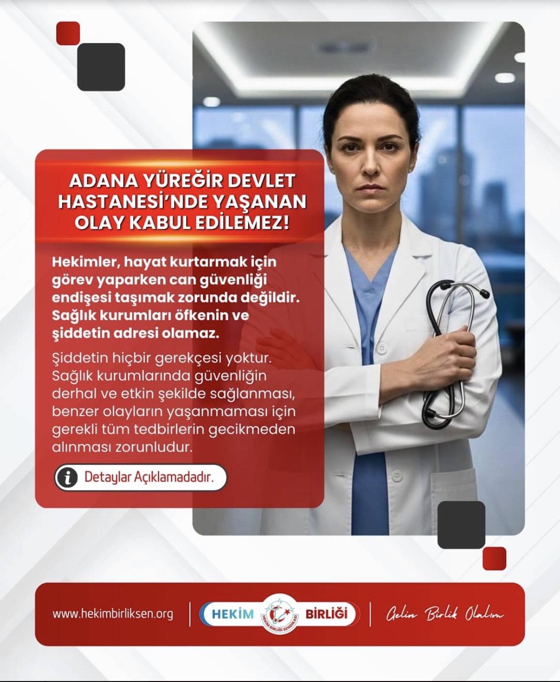 Hekim Birliği Sendikası, Adana Yüreğir Devlet Hastanesi’nde bir hastanın vefatının ardından hasta yakınlarının acil servise basıp, hekimlere şiddet uygulamasını kabul edilemez olarak nitelendirdi.