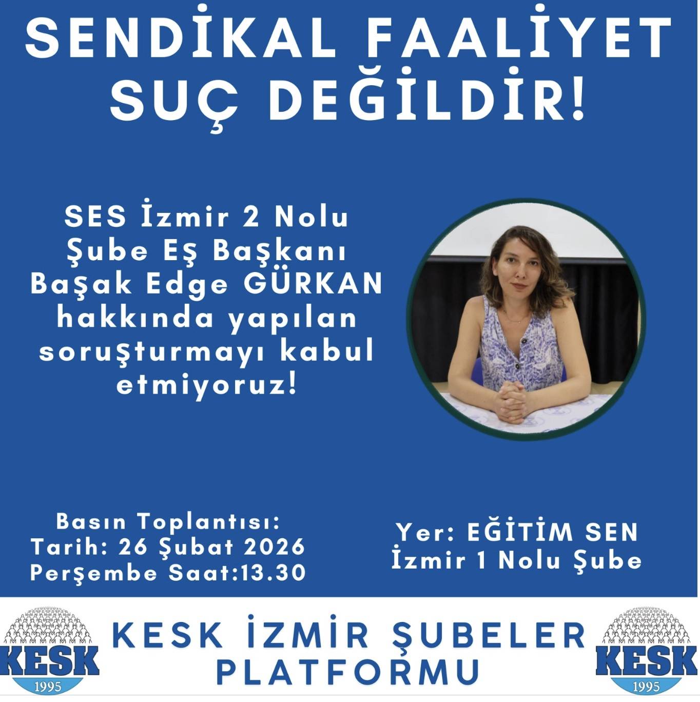 Şu an SES İzmir 2 No’lu Şube Eş Başkanı olan Başak Edge Gürkan hakkında KESK’in aldığı sendikal eylem kararına katılması nedeniyle soruşturmaya tabi tutulduğu bildirildi. KESK’ten yapılan açıklamada, “Önceki dönem KESK sözcümüz +Başak Edge Gürkan arkadaşımızın Konfederasyonumuz KESKin almış olduğu sendikal eylem kararına katılması nedeniyle sorustumaya tabi tutulması, sendikal hakların kısıtlanması konusunda basın açıklaması yapılacaktır” denildi. (BSHA – Bilim ve Sağlık Haber Ajansı)